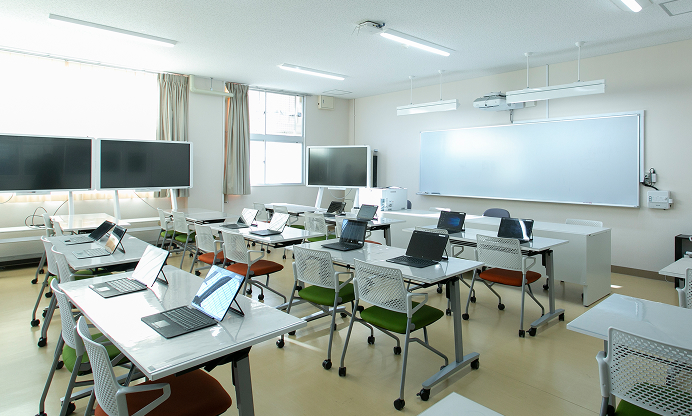 全教室に最新式のレーザープロジェクターや動画配信システムを設置、ICT機器を活用した授業を行っています。