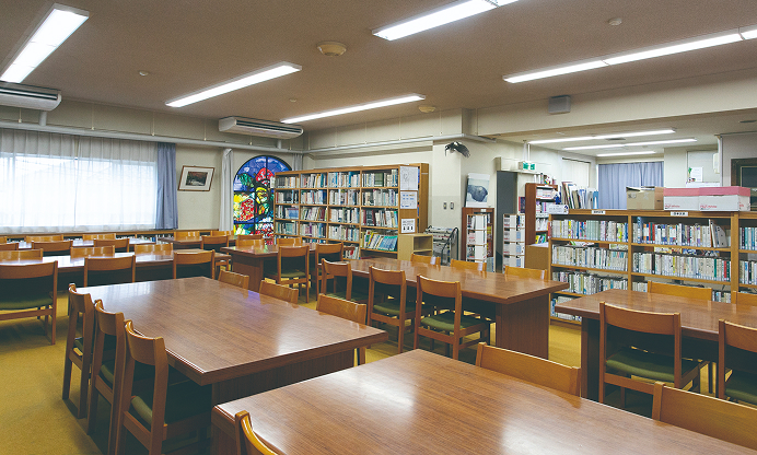 図書室 蔵書の数は3万冊。落ち着いた雰囲気と、ステンドグラスの輝く明るい閲覧室で、毎日多くの生徒が読書や学習に励んでいます。