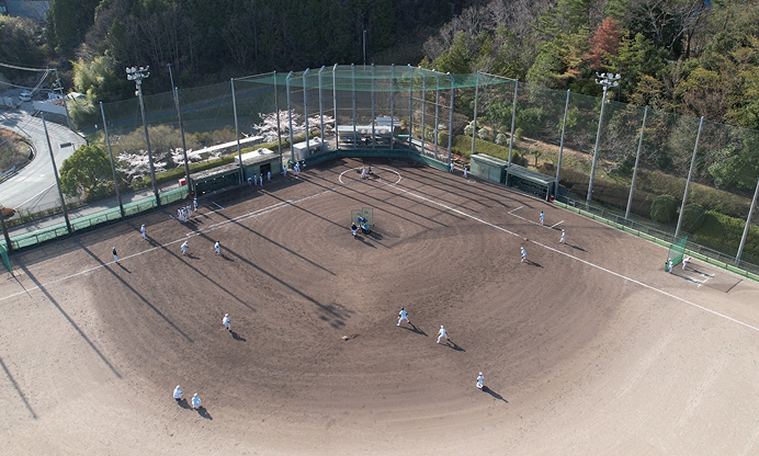 - 野球部が毎日練習する専用グラウンドです。マシーンブースのある室内練習場やクラブハウスなど恵まれた環境が整っています。