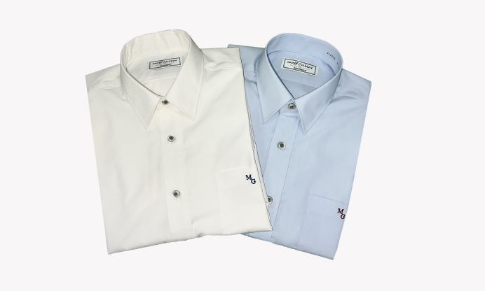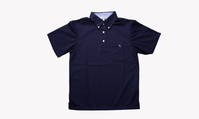ネイビー色のポロシャツにワンポイントでMGマークのシンプルなデザイン。